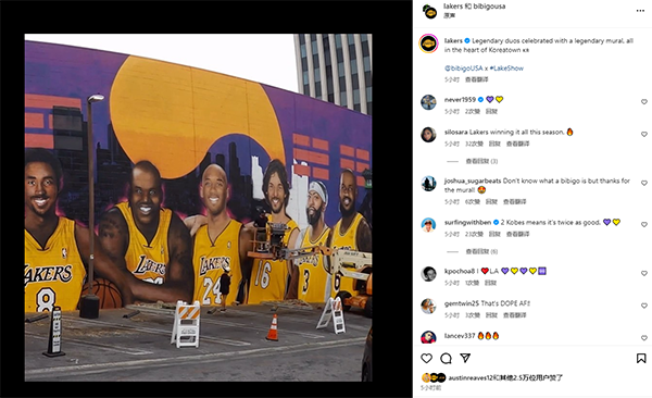 湖人官方还晒出在洛杉矶当地的一处新巨幅壁画,配文写道:在洛杉矶Koreatown的中心地带,用一副传奇壁画致敬创奇二人组。