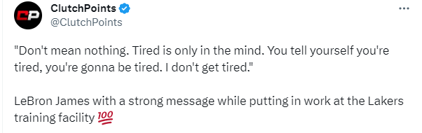 詹姆斯喊话永不言累,几十年如一日,每天坚持训练以及保养身体,都快39岁了,三旬老汉仍旧位居联盟顶级球星之列,事实证明,天赋、努力和自律都是成功的必备因素,老詹不愧为无数球迷心目中的优质偶像。