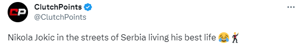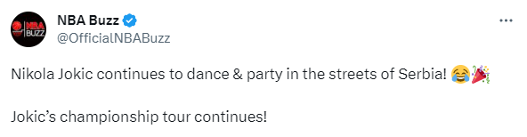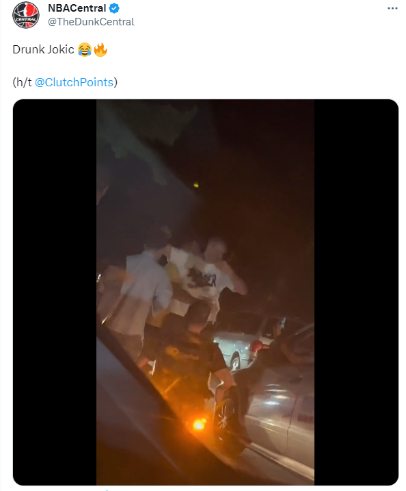 约基奇现身街头兴奋跳舞尽享夜生活引热议,美媒纷纷转发这一幕,NBACentral配文写道:约基奇喝醉了;ClutchPoints表示约基奇在塞尔维亚街头享受最好的生活;NBA Buzz表示约基奇在塞尔维亚街头跳舞参加派对,继续庆祝夺得总冠军。
