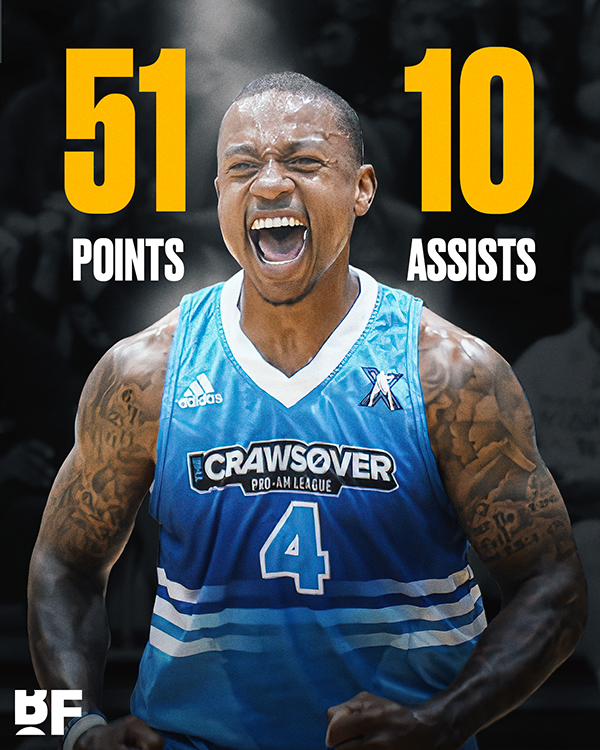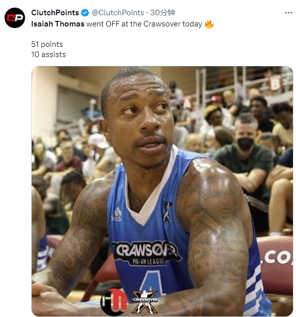 34岁的小托马斯再次在半职业联赛中打出疯狂的表现,上半场20分6助攻,全场轰下51分10助攻带队夺冠;2年前,小托马斯曾在这个联赛中狂砍81分,创造TheCrawsOver联赛单场最高得分纪录,至今没人能够打破。