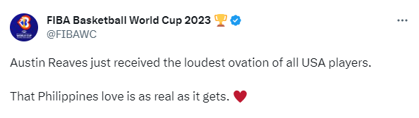 赛后谈到自己在菲律宾的高人气时,里夫斯表示:我已经预见到了这一点,我和湖人助教菲尔-汉迪交谈过,他告诉我‘他们喜欢湖人队’。这对我来说很特别,我来自一个非常小的小镇,没有多少人预计到我能出现在这里,能够代表我们的国家出战,所以他们接受我的方式,对我来说意味着很多。