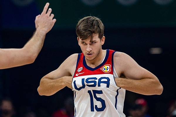 178直播08月27日讯此前美国男篮27分大胜新西兰,湖人新星里夫斯闪耀世界杯,全场替补出战22分钟,6投4中拿到12分6助攻3抢断,助攻领跑美国男篮全队,正负值+19,赛后爱德华兹高呼:你就是那个男人;里夫斯在菲律宾的人气超高,赛前入场时获得美国全队最高的欢呼声,小球迷举“里夫斯>詹姆斯”的标牌。