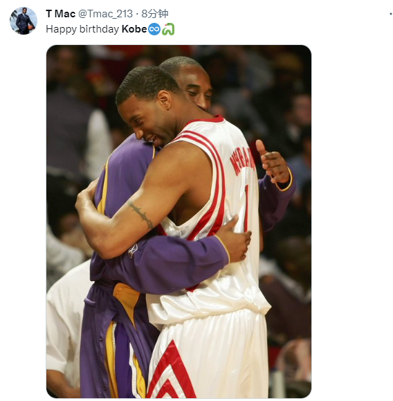 火箭名宿麦迪晒他昔日身穿火箭1号球衣拥抱科比的画面,配文写道:科比生日快乐,永远的黑曼巴。