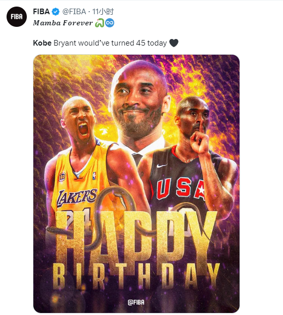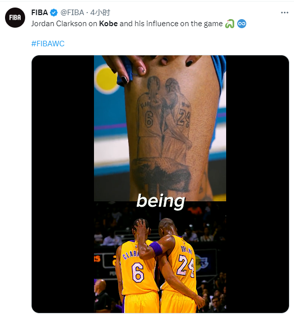 FIBA祝贺科比:今天科比45岁了,永远的黑曼巴;FIBA还晒出克拉克森把他与科比的合影纹在腿上的画面,克拉克森表示科比就是他心目中的GOAT。