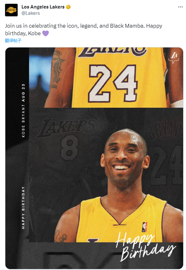 湖人官方晒照祝贺科比45岁生日,写道:和我们一起来祝偶像、传奇和黑曼巴。生日快乐,科比。湖人官方还晒出科比生涯高光时刻以及2001年坐在更衣室中抱着总冠军奖杯的催泪一幕。