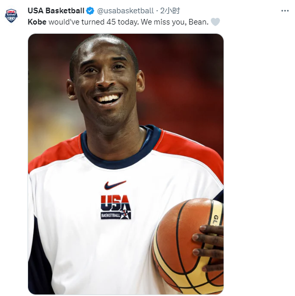 美国男篮晒科比身穿国家队10号球衣的旧照,配文写道:今天本来应该是科比45岁的生日。小豆,我们想念你(Wemissyou,Bean)。
