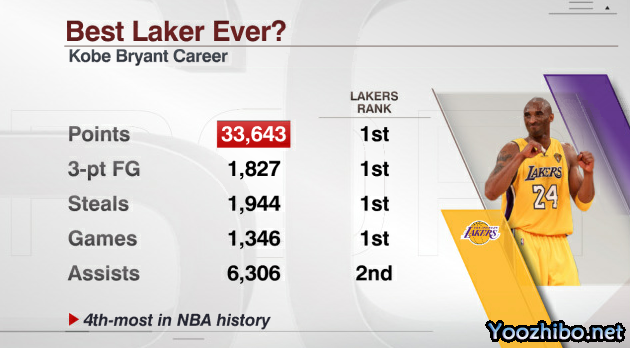 2020年1月26日,41岁的科比和Gigi因遭遇飞机事故而不幸离世,当时飞机上的全部人员都遇难了;科比职业生涯20年全都为湖人效力,出战1346场常规赛,场均拿到25分5.2篮板4.7助攻,科比是湖人队历史上出场次数、得分、投篮命中数、三分命中球、罚球命中数数和抢断数最多的球员,而助攻数仅次于魔术师约翰逊排名队史第二。