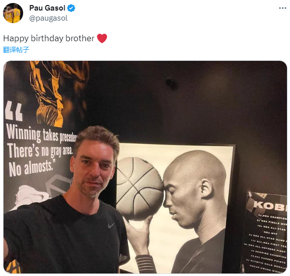 湖人名宿加索尔晒与科比自传的宣传板的合影表示纪念,写道:生日快乐,兄弟。在此前名人堂典礼上,加索尔表示他原本希望科比给他当引荐人;加索尔致谢科比时表示:如果没有你我不会在这里,多么希望你和GIGI今晚能够在现场和我们一同庆祝啊,我想念你,爱着你兄弟。
