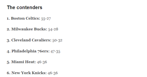 按照ESPN专家的预测,新赛季凯尔特人将力压雄鹿成为东部常规赛冠军,雄鹿东部第二,第三至六名依次是骑士、76人、热火和尼克斯,根据这样的预测,明年季后赛骑士将在首轮再次大战尼克斯,76人则大战热火。