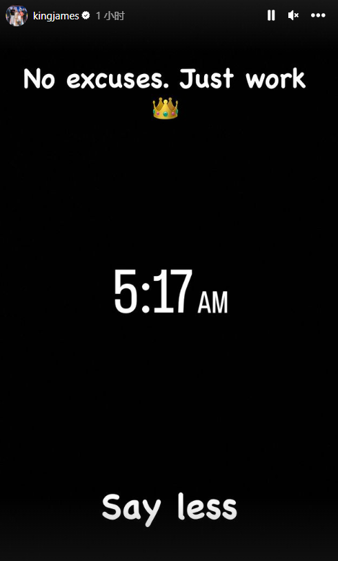 演唱会结束之后,38岁的詹姆斯仅仅休息几个小时便凌晨起床苦练;詹姆斯更新动态,晒出洛杉矶当地时间凌晨5点17分的时间刻度,配文写道:没有借口。就是训练(王冠表情),无需多言。