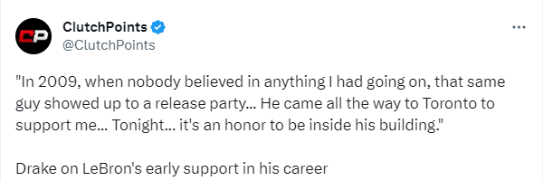 Drake在舞台上表示:在2009年,当没有人相信我在做的任何事情时,那个家伙出席了一场发行派对,为的是一张名叫《So Far Gone》的混合专辑,我不知道你们是否听说过这个。他亲自前往多伦多支持我,而当时的我还在搞清楚如何实现我的梦想。因此今晚,无论过去了多少年,能够在他的主场之内进行演出是一种荣幸。