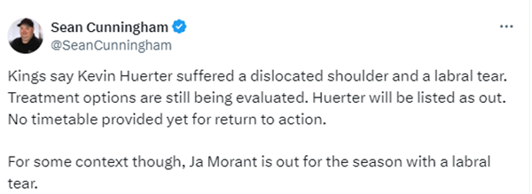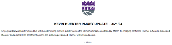 178直播讯 北京时间3月22日,国王队遭伤病打击,据名记报道,国王官方已经宣布,凯文-赫尔特左肩脱臼,盂唇(手臂骨与肩胛骨之间的肩关节)撕裂,没有回归时间表,治疗方案仍在评估中,预计他将长期缺席;灰熊球星莫兰特就因这样的伤病而提前赛季报销。