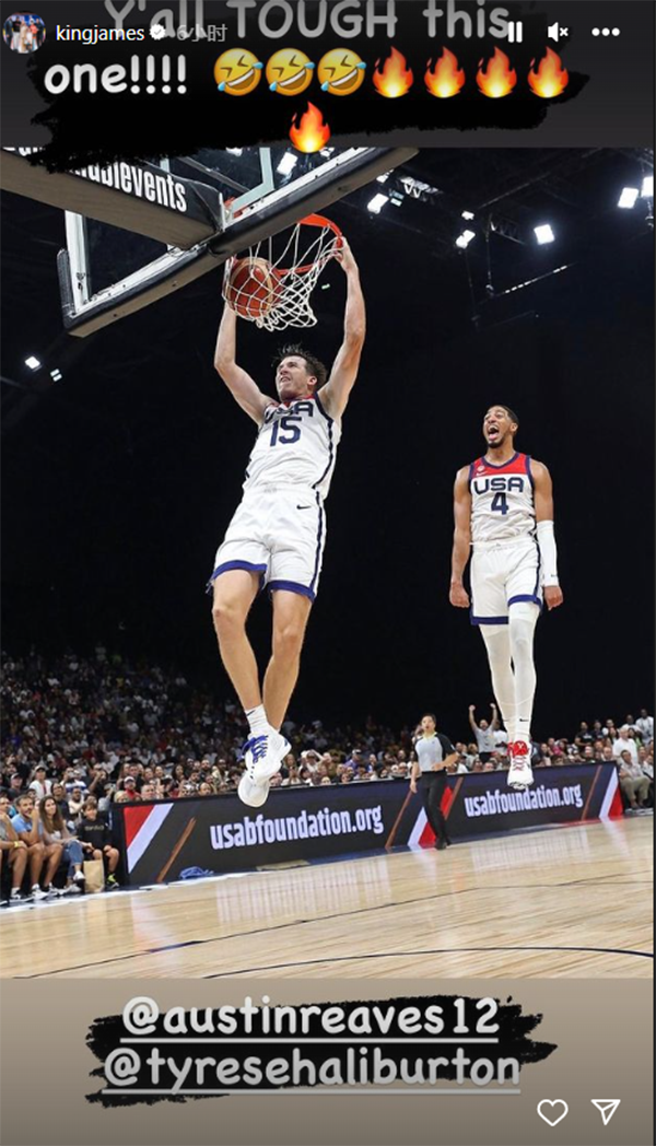 今天詹姆斯还转发里夫斯暴扣、哈利伯顿悬浮庆祝的画面,配文写道:你俩整得挺难啊(笑哭+火表情)。