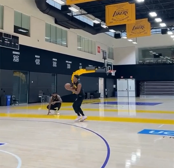 詹姆斯和八村垒一起在湖人训练馆中备战新赛季,期间八村垒加练三分球时,詹姆斯全程蹲在地板上专注于观看队友训练,身穿黑色小背心,粗壮的手臂抢镜。