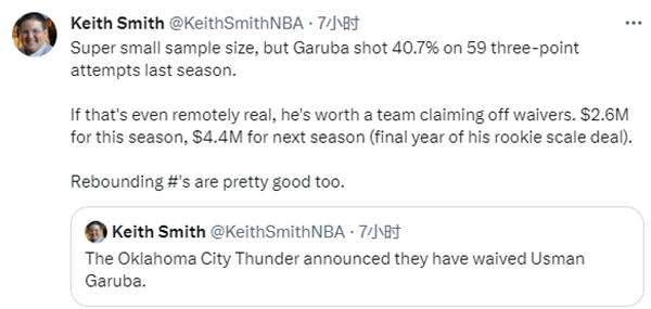 名记Keith Smith表示虽然样本量很小,但加鲁巴上赛季尝试出手59次三分,命中率为40.7%,他值得一支球队认领他;新赛季加鲁巴年薪是260万美元,24-25赛季440万美元(新秀合同的最后一年)。