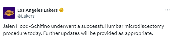 178直播讯 北京时间3月22日,湖人队又遭伤病打击,湖人官方宣布,球队的17号秀杰伦-胡德-席菲诺于今天成功接受了腰椎微创椎间盘切除手术,没有提供复出时间表。微创椎间盘切除手术:一种外科手术,通过微小的切口使用显微镜或者放大镜来切除椎间盘突出部分,以减轻对神经根或脊髓的压迫。