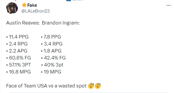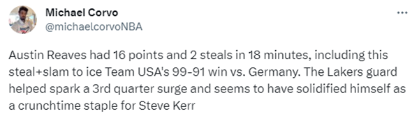 里夫斯对阵德国贡献16分成逆转功臣之一,鹈鹕球星英格拉姆全场6投1中仅仅贡献3分;纵观美国队5场热身赛,里夫斯场均拿到11.4分2.4篮板2.2助攻,投篮命中率60.6%、三分命中率57.1%,反观英格拉姆,场均仅拿到7.8分3.4篮板1.8助攻,希望他们都能在世界杯正赛中打出更好的表现。