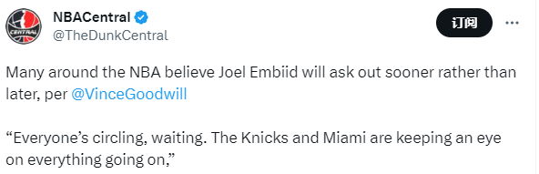 据名记Vincent Goodwill报道,很多人都相信恩比德很快会申请交易;尼克斯和热火正在等待事情的进展,他们在密切关注恩比德的情况。