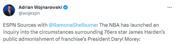 联盟介入调查哈登炮轰莫雷事件