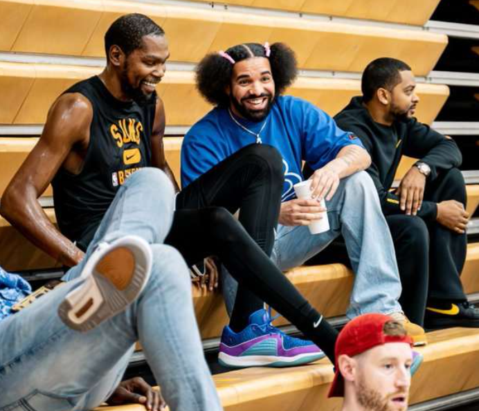 杜兰特参加Drake的演唱会,之后Drake探营杜兰特的训练,两人坐在一起开心畅聊,Drake的发型十分抢镜。