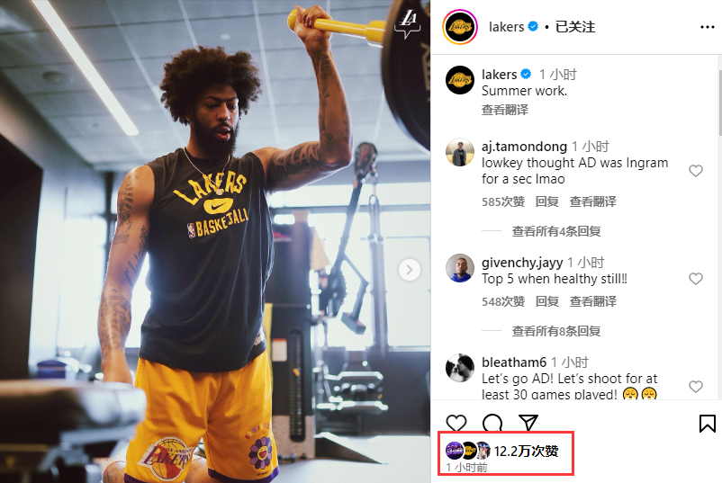 看到湖人队晒浓眉的训练照,詹姆斯手动点赞。
