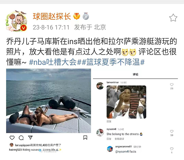 拉尔萨看中马库斯哪里呢?或许体育媒体人“球圈赵探长”的表态就是最好的答案,近期,“球圈赵探长”也是晒出了马库斯和拉尔萨在游艇嬉闹的照片并且配文表示:乔丹儿子马库斯在ins晒出他和拉尔萨乘游艇游玩的照片,放大看他是有点过人之处啊。评论区也很懂嘛。