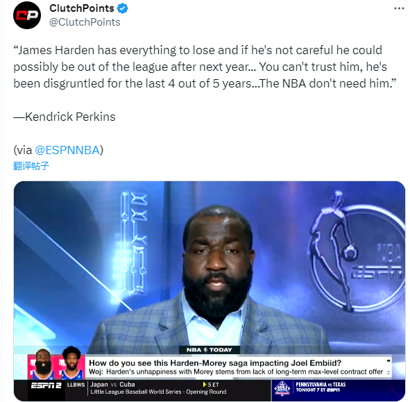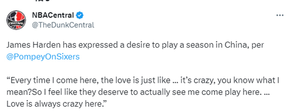 Pompey还表示如果哈登没被交易,并且坚持不为76人效力,他前往中国打球也不会那么容易。