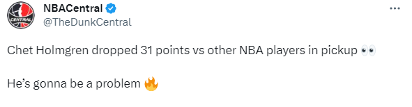 上赛季,雷霆榜眼霍姆格伦因伤赛季报销,2023-24赛季,霍姆格伦将迎来他的NBA生涯首秀;最近一段时间,霍姆格伦一直与杜兰特等球员一起训练以及比赛。