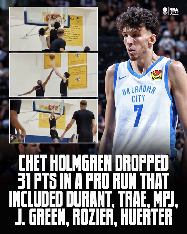 美媒NBA BUZZ表示霍姆格伦在这一场NBA球员组成的比赛中狂砍全队97分中的31分,大多数得分都是在杜兰特头上拿到的,切特会赢得年度最佳新秀吗?