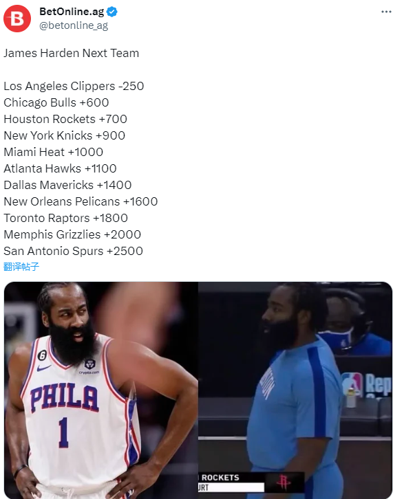 哈登炮轰莫雷后他的最新下家赔率出炉,快船居首,火箭排在第三位,具体情况如下: