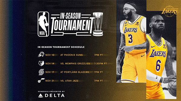 湖人官方公布锦标赛具体赛程——11月11日上午11点,湖人客场对阵太阳;11月15日上午11点30分,湖人主场对阵灰熊;11月18日上午11点,湖人客场对阵开拓者和11月22日上午11点,湖人主场对阵爵士;其中湖人对阵太阳和对阵爵士这两场比赛是全美直播,小组赛总共有16场全美直播。