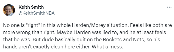 名记Keith Smith更推评论道:“整个哈登和莫雷的情况,没有人是‘正确’的。感觉双方错的都比对的多。也许哈登被骗了,至少他自己感觉被骗了。但这家伙基本上也放弃了火箭和篮网,所以他自己也不干净。真是一团糟。”