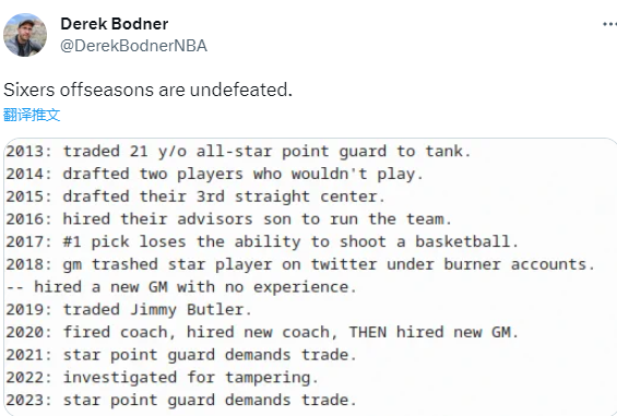 76人记者Derek Bodner列出了76人在最近10年里每个休赛期的离谱操作,并且自嘲道:76人休赛期根本无法被打败。