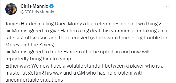 名记Chris Mannix表示哈登炮轰莫雷是骗子的原因有两个——一是去年休赛期,莫雷在哈登降薪后同意在今年夏天给他一份大合同,但后来莫雷又食言了;二是莫雷同意交易哈登,但据报道现在他们将会把哈登带回训练营,这让哈登十分不舒服;目前哈登与总经理之间存在着不稳定的对峙。