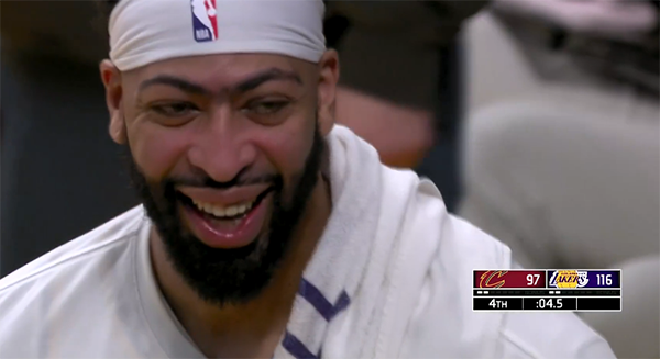 下半场,骑士16-4反超比分,见状浓眉在进攻端发力,带队打出19-0攻击波,期间浓眉一个人贡献9分;末节浓眉和詹姆斯带领湖人掌控局面,最终稳稳拿下比赛,浓眉咧嘴大笑太开心。