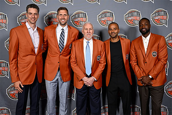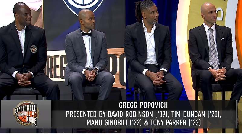 波波维奇正式上台发表入堂演讲,全场观众为他起立鼓掌,大卫-罗宾逊、邓肯、吉诺比利和帕克全都上台,他们四人都是老爷子的引荐人,其中帕克是刚刚才正式入堂的。