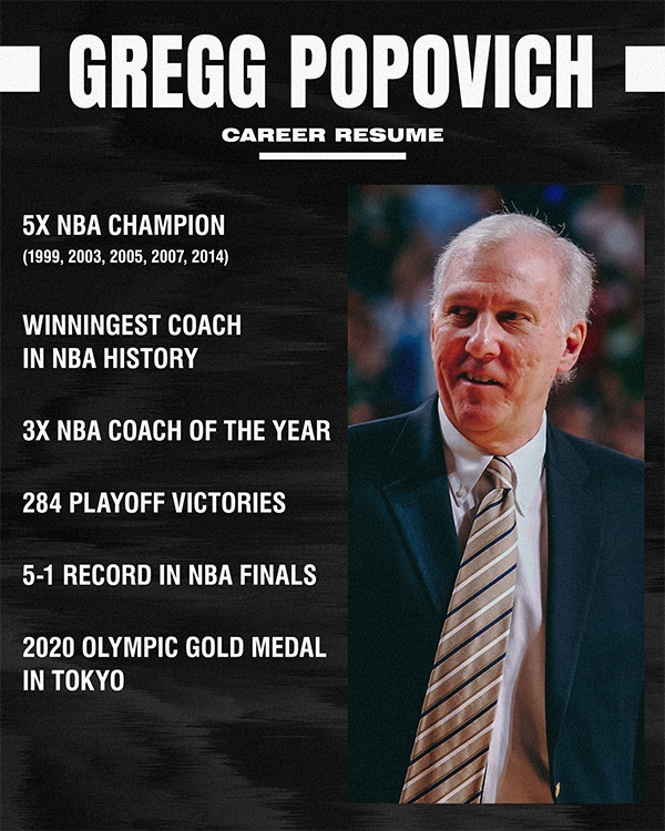波波维奇是NBA历史执教胜场最多的主教练(常规赛1366胜历史第一),今夏与马刺续签5年超过8000万美元的历史最大合同,74岁了仍旧继续执教马刺,他曾带领马刺6次杀进总决赛5次夺得总冠军,三次当选NBA年度最佳主帅,四次当选全明星赛西部主帅。