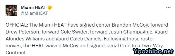 今日热火官方宣布,球队签下中锋布兰登-麦考伊、前锋德鲁-皮特森、前锋科尔-斯威德、前锋贾斯汀-尚帕尼、后卫阿隆德斯-威廉姆斯和后卫凯莱布-丹尼尔斯共6名球员;随后热火裁掉了布兰登-麦考伊,然后和贾马尔-凯恩签下了一份双向合同。