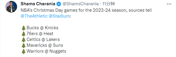 shams曝光NBA新赛季的年终大战赛程,具体为(按时间顺序排序,后方为主场)——雄鹿VS尼克斯、76人VS热火、凯尔特人VS湖人、独行侠VS太阳和勇士VS掘金。
