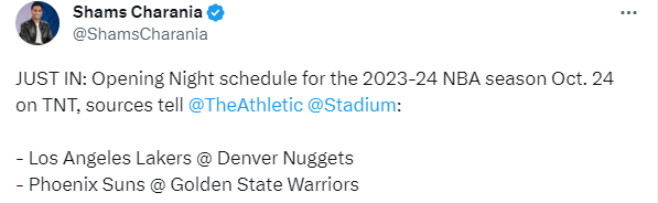 178直播讯08月11日,NBA新赛季的揭幕战和年终大战的赛程出炉,名记shams报道,2023-24赛季揭幕战的两场比赛分别是湖人大战掘金和勇士大战太阳,四支西部豪强将在10月25日打响新赛季揭幕战;湖人将在年终大战对决凯尔特人,勇士则是大战掘金。