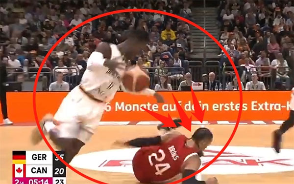 178直播讯08月10日,FIBA热身赛德国86-81击败加拿大,湖人旧将施罗德全场拿到16分8篮板7助攻,带队击败看起来很强大的加拿大;比赛期间,施罗德嘲笑狄龙-布鲁克斯一幕曝光,后者扑抢失败摔倒在地,施罗德伸出手指嘲笑他。