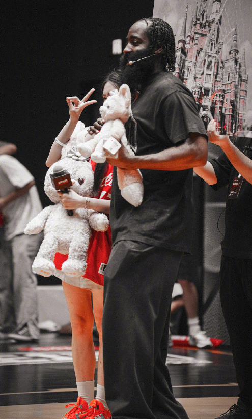 哈登尽可能与球迷互动,现场有球迷成功求婚,哈登跟着起哄:亲她(Kiss her)。