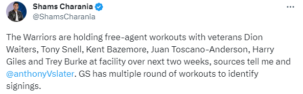 名记shams曝光勇士未来2周的试训名单,六名自由球员分别是——迪昂-维特斯、托尼-斯内尔、贝兹莫尔、托斯卡诺-安德森、哈里-贾尔斯以及特雷-伯克;勇士队准备了数轮试训以确定引援,勇士目前阵容中还剩两个标准合同的空位以及两个双向合同的空位。