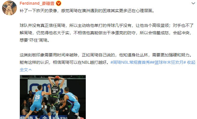 当然作为一名新来到联盟的中国球员,与队友配合还不是很默契,同时对手看衰是很正常的,毕竟中国男篮的球员并没有太多在NBL联盟证明过自己、打出巨星级别水准的球员,所以从这个角度来看,周琦也属于是扮演“拓荒者”的角色。期间经历被看衰、证明自己的过程也是不可避免的。