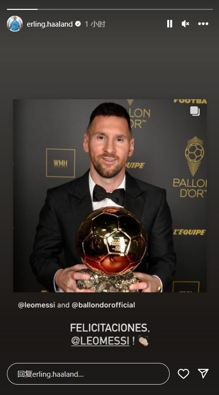 178直播11月01日,效力于曼城的挪威天才哈兰德更新了社交媒体,他转发了梅西晒出的手捧金球照片,配文:“祝贺你,梅西!”并附上鼓掌表情以示致敬,值得注意的是,哈兰德还特意@了梅西,并且用西班牙语来写祝贺,可谓颇具用心。
