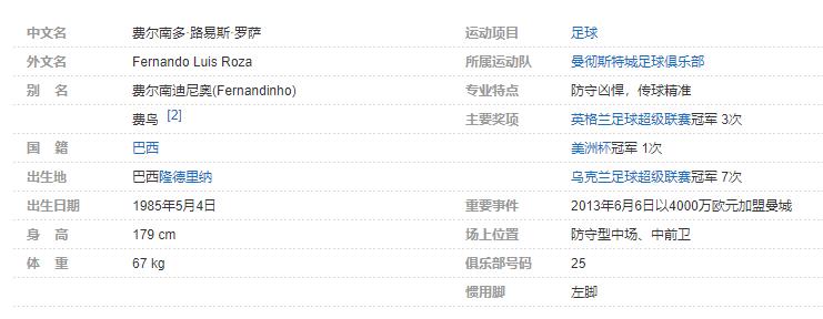费尔南迪尼奥(Fernandinho),全名费尔南多·路易斯·罗萨(Fernando Luis Roza),1985年5月4日出生于巴西隆德里纳,巴西职业足球运动员,司职中场,现效力于英格兰足球超级联赛的曼彻斯特城足球俱乐部,并担任球队队长。