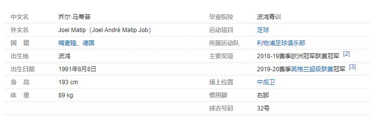 乔尔·马蒂普(Joel Matip),全名乔尔·安德烈·马蒂普·乔布(Joel André Matip Job),1991年8月8日出生于德国波鸿,拥有喀麦隆/德国双重国籍,喀麦隆足球运动员,场上司职中后卫,效力于英格兰足球超级联赛的利物浦足球俱乐部。