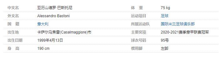 亚历山德罗·巴斯托尼(Alessandro Bastoni),1999年4月13日出生于意大利卡萨尔马焦雷(Casalmaggiore)市,意大利足球运动员,司职后卫,现效力于国际米兰足球俱乐部。 [1]  2020-21赛季,巴斯托尼帮助国际米兰夺得意甲冠军。