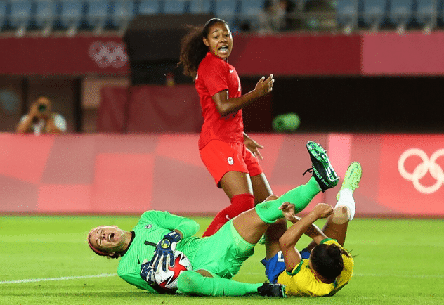 1/4决赛对阵巴西女足,加拿大女足劣势明显,全场比赛仅仅1次射正,而巴西女足有5次射正,最终加拿大还是在120分钟内踢平了巴西女足,最终通过点球4-3淘汰对手;半决赛,加拿大女足延续了神奇,全场比赛被美国女足轰13脚,5次被射正,依然0失球,己方则在4次射门2次射正的情况下收获1粒进球,从而1-0拿到胜利。