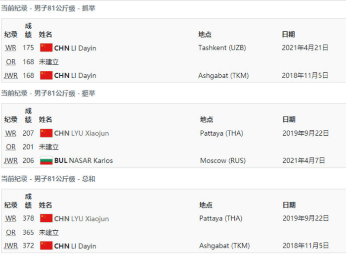 值得一提的是吕小军保持着举重81公斤级的抓举175公斤、挺举207公斤和总成绩378公斤的世界纪录,是这个项目的霸主。他的前两届奥运会都是参加的77公斤重量级的比赛,2012年吕小军总成绩打破世界纪录夺得冠军。2016年,总成绩相同的情况下比哈萨克斯坦选手重,所以获得了银牌。在这个东京奥运会周期,5年的时间,吕小军从77公斤升到81公斤。